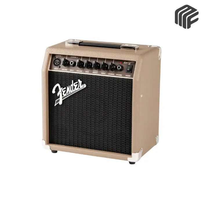 Fender Acoustasonic 15 لديه مواصفات مصممة للتعبير الصوتي الواضح. أولاً، يعمل بقوة 15 واط من خلال سماعة 6 بوصة ذات تصميم مخروطي خاص (Special Design). هذه السماعة مصممة خصيصاً لتعزيز الوضوح الصوتي والترددات العالية (High-Frequencies). ثانياً، يحتوي على قناتين منفصلتين: القناة الأولى للجيتار (بمفتاح تحكم في مستوى الصوت والترددات الثلاثة: Treble, Mid, Bass) والقناة الثانية للمايكروفون (مدخل XLR مع مستوى صوت منفصل). علاوة على ذلك، تتوفر ميزة Chorus الرقمية للجيتار، والتي يمكن تعديلها، إذ تضفي عمقاً وثراءً على النغمة الصوتية. يتميز أيضاً بمدخل سماعات رأس لممارسة هادئة.
