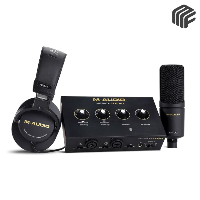 حزمة M-Audio M-Track Duo HD تقدم لك مجموعة من العناصر. أولاً، هي تحتوي على كارت صوت يوفر مدخلين. وهما يسمحان لك بتوصيل الميكروفون والآلات الموسيقية. ثانيًا، هي توفر لك ميكروفون M-100. هو من نوع condenser. هذا يجعله مثاليًا لتسجيل الغناء والآلات الصوتية. إضافة إلى ذلك، هي تأتي مع سماعات رأس HDH-141. هي من النوع المغلق. هذا يسمح لك بالمراقبة الدقيقة. من ناحية أخرى، نحن نوفر لك كابل XLR. وهذا يضمن لك توصيلاً سهلاً.